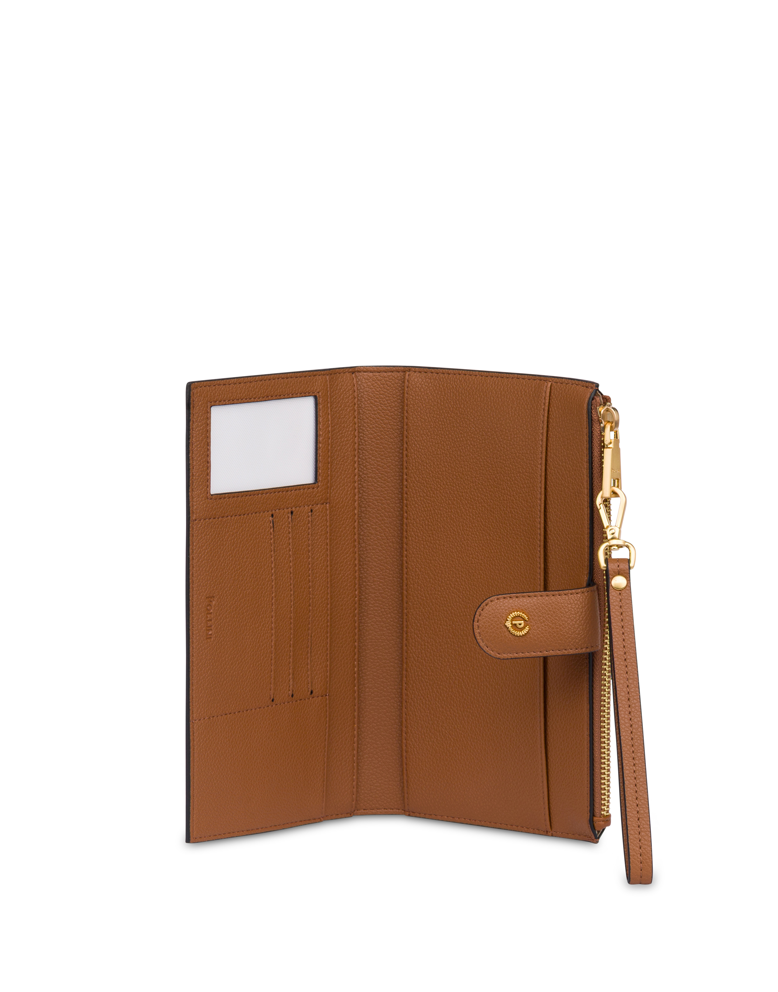 Geldbörse aus superweichem, praktischem, raffiniertem Material, dank der abnehmbaren Handgelenkschlaufe am Handgelenk tragbar. Der große zentrale Knopf mit dem Logo „P Alloro“ mit Galvanisierung in gebürstetem Gold und Light Gold setzt einen markanten, eleganten Akzent. Das Innere ist funktional und gut organisiert, mit Fächern für Karten, Geldscheine und Dokumente sowie einer Münztasche mit Reißverschluss: perfekt, um Ordnung zu halten, ohne auf Stil zu verzichten.