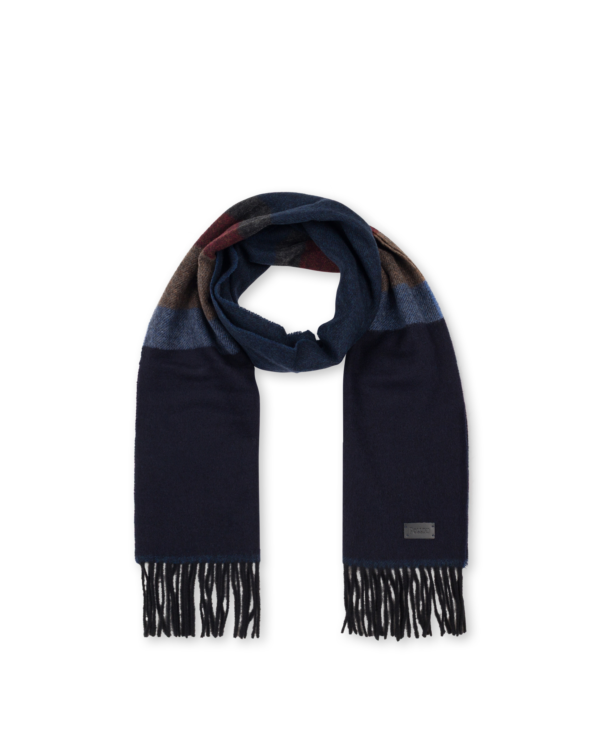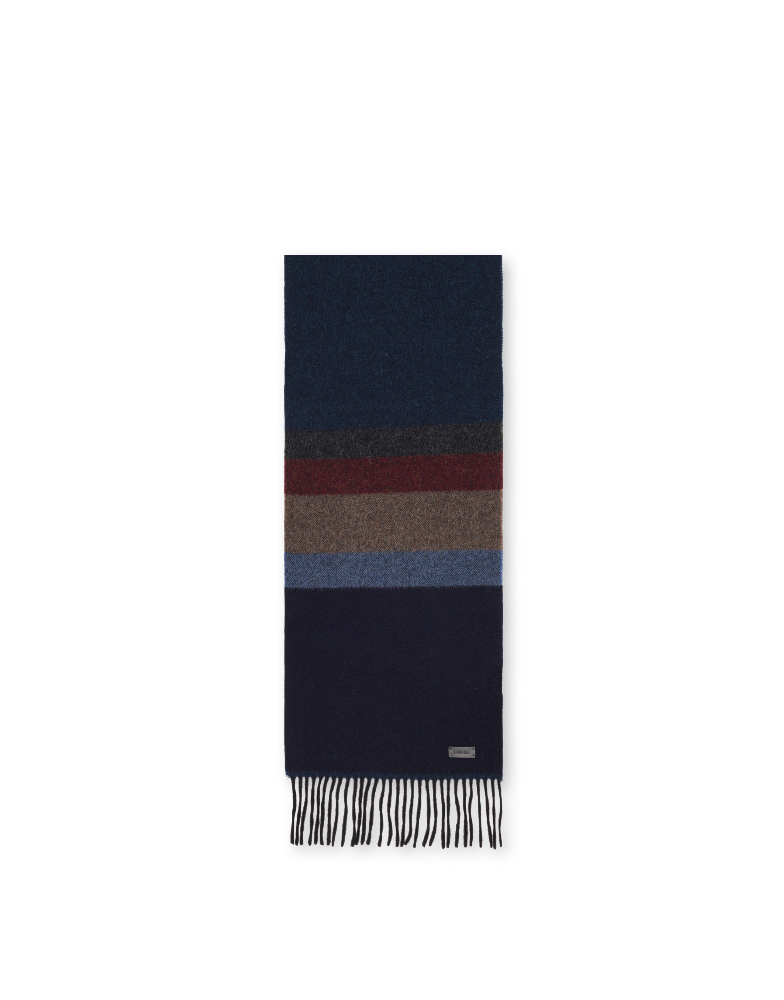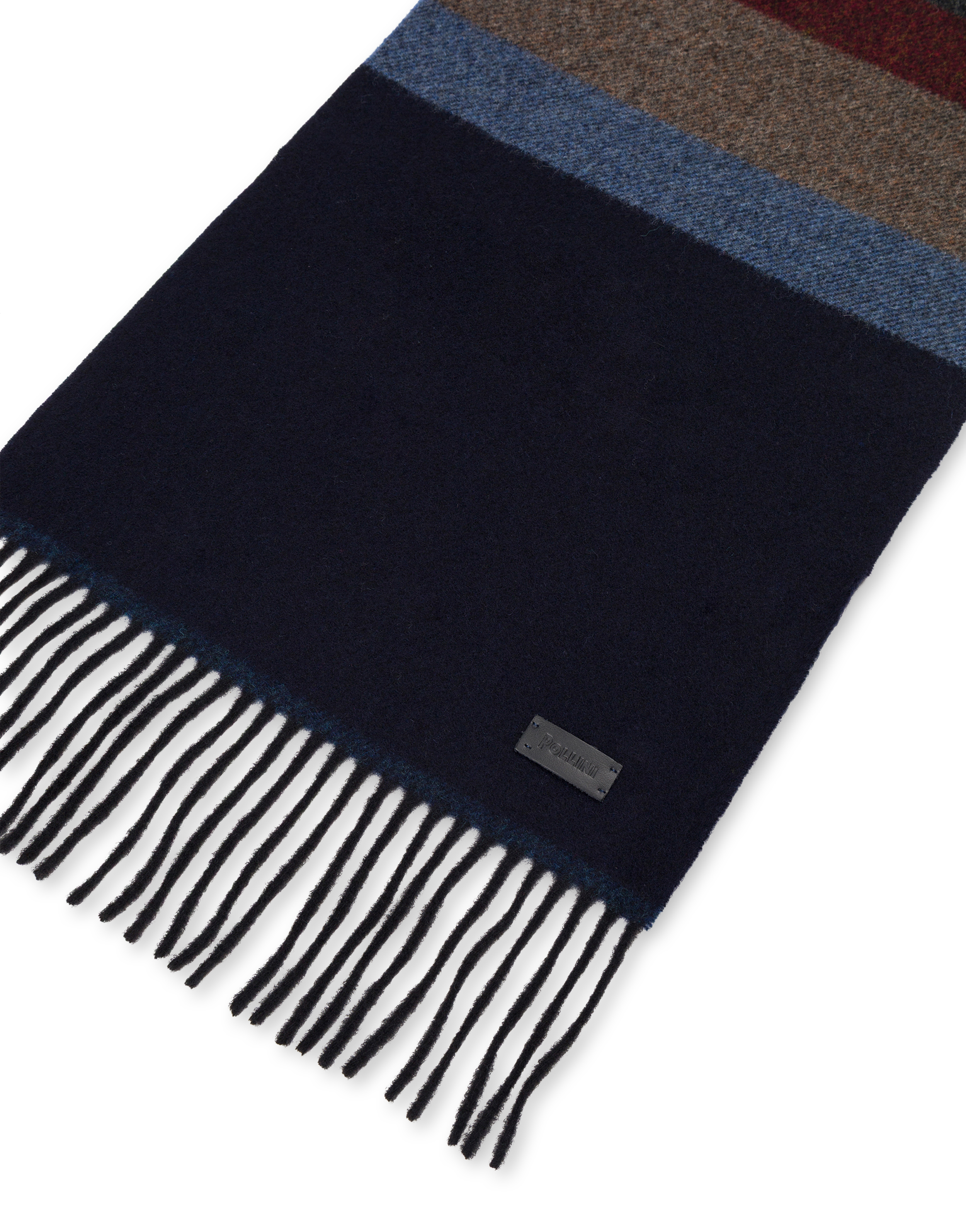 Unisex-Schal aus Wolle mit kontrastierenden Streifen. Ausgefranste Ränder. Leder-Logo-Label am Rand.
