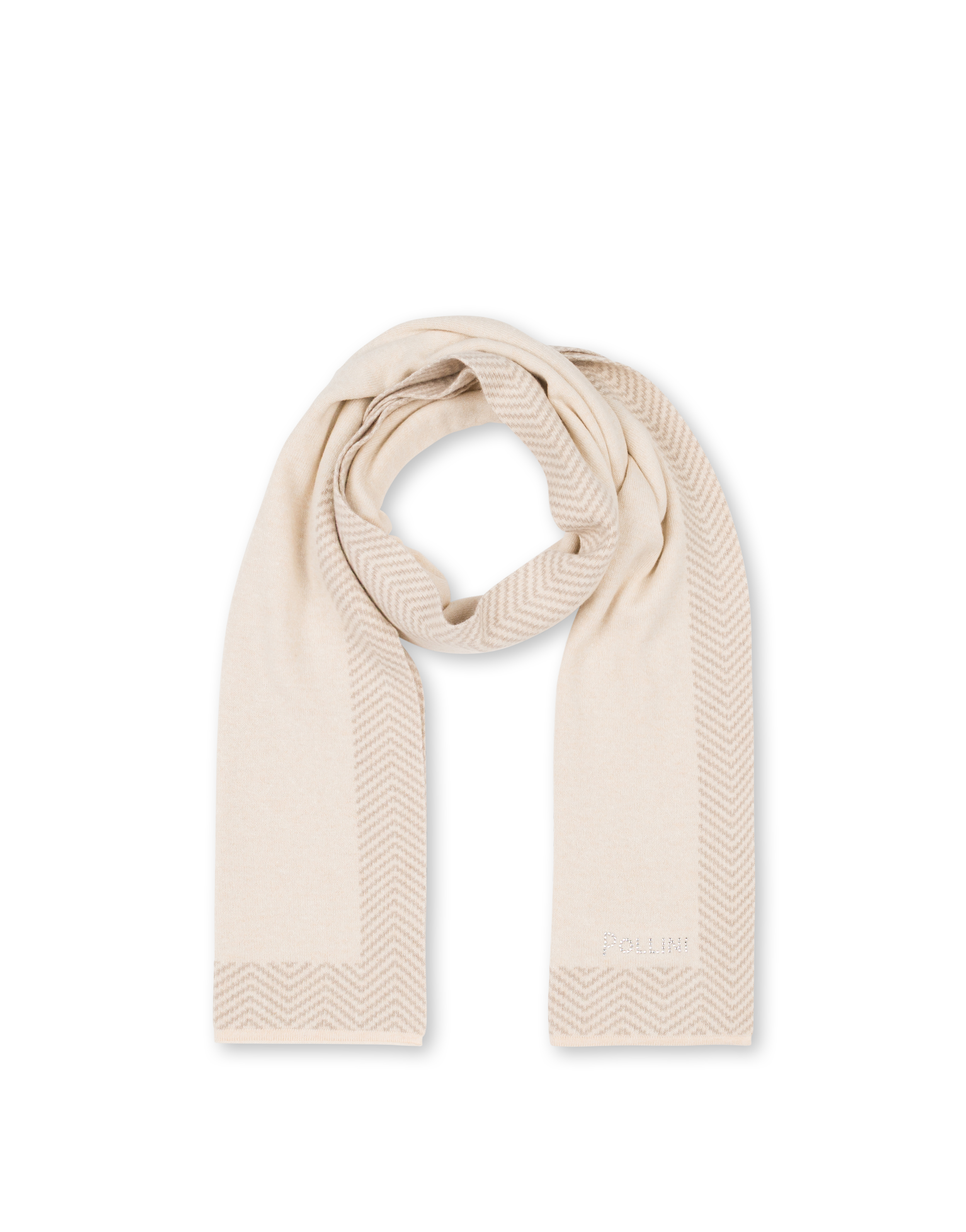 Schal aus einfarbiger Wollmischung mit kontrastierendem Chevron-Print. Der Druck erinnert an die ikonischen Details der Lederwaren von Pollini. Der Logo-Schriftzug aus Glitzersteinen personalisiert den Druck.