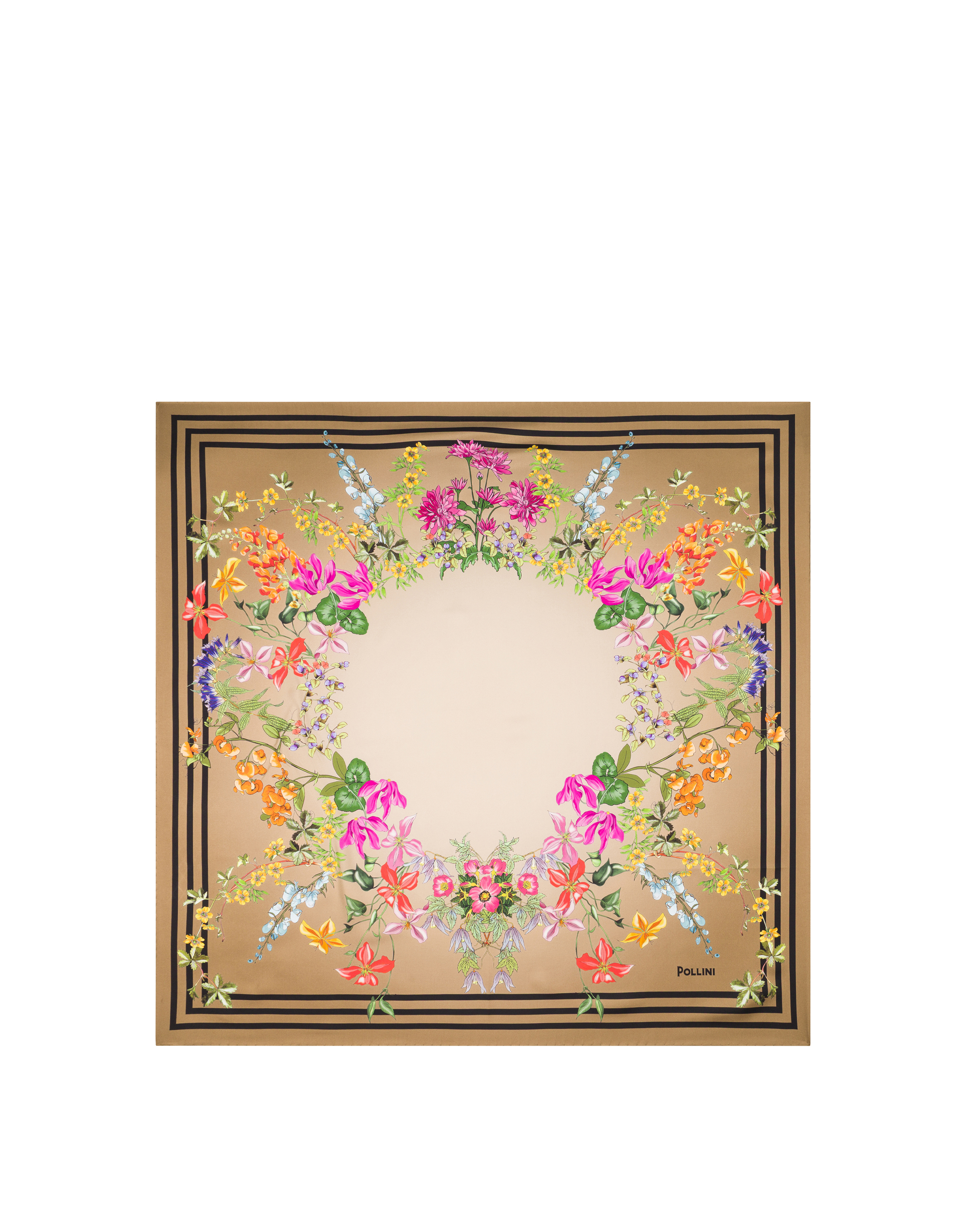 Schal aus Seidentwill mit malerischem Druck mit kreisförmigen Blumen. Der dreifache Kontrastrahmen schafft ein geometrisches Detail.