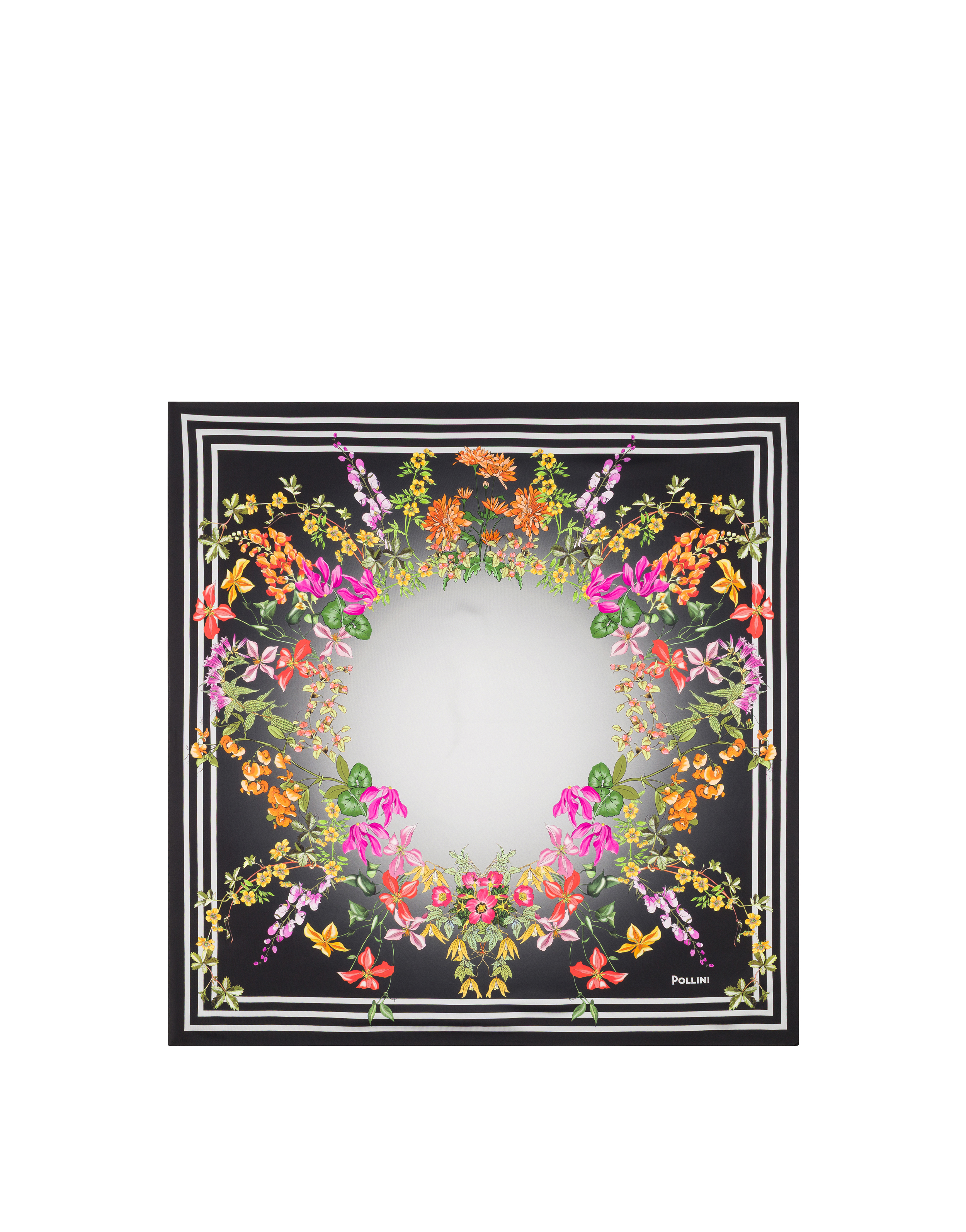 Schal aus Seidentwill mit malerischem Druck mit kreisförmigen Blumen. Der dreifache Kontrastrahmen schafft ein geometrisches Detail.