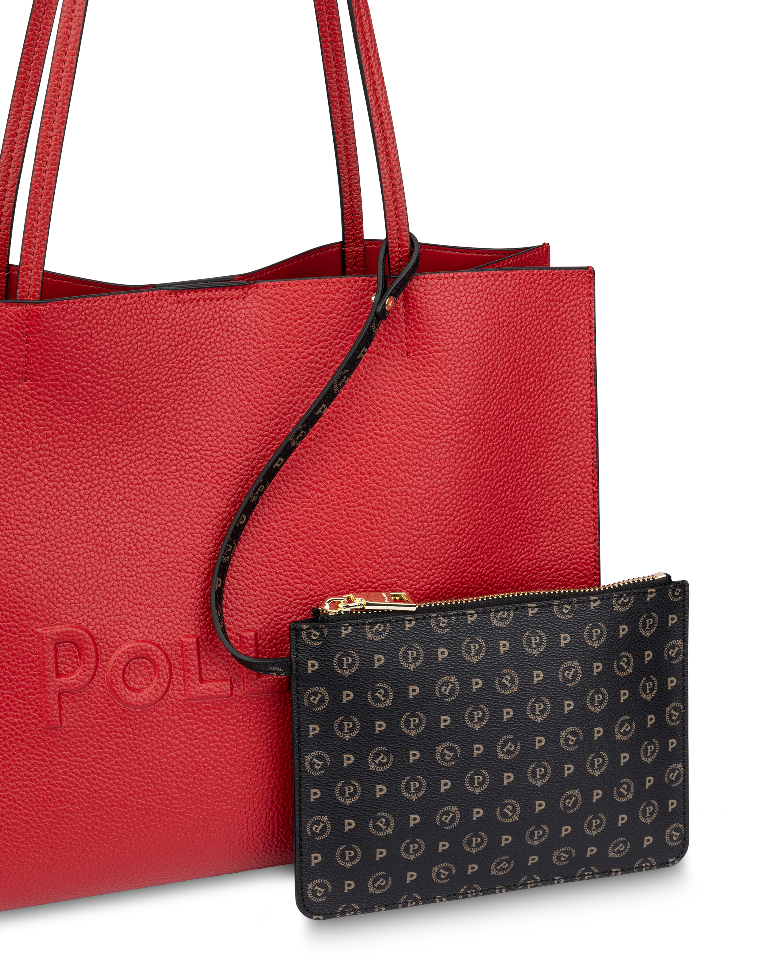 The new Aurora Tote Bag blends style and functionality in a horizontal design with a contemporary look. Featuring a spacious silhouette and long double handles, it ensures convenient and versatile portability. The embossed Pollini logo, proposed in a macro format, adds a distinctive and sophisticated twist. The model is completed by a removable internal pouch featuring the Heritage motif, perfect for its organizing internal compartments with practicality and sophistication.