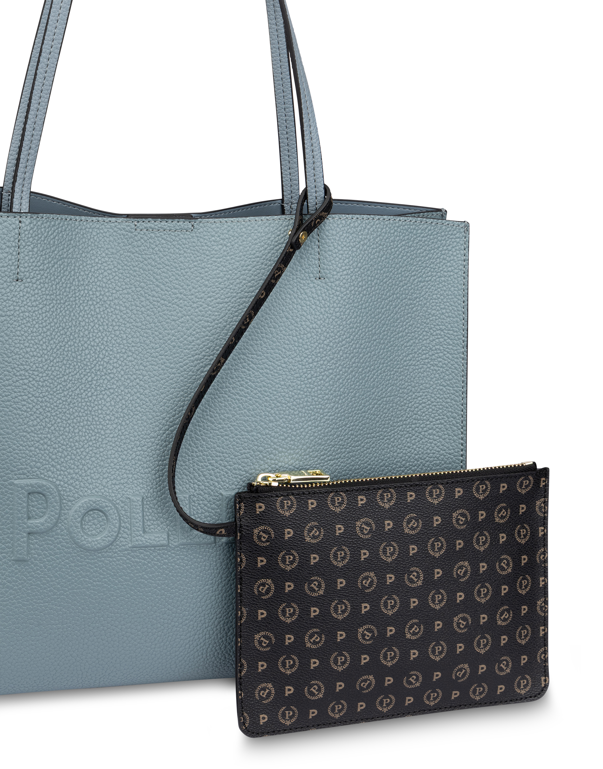 The new Aurora Tote Bag blends style and functionality in a horizontal design with a contemporary look. Featuring a spacious silhouette and long double handles, it ensures convenient and versatile portability. The embossed Pollini logo, proposed in a macro format, adds a distinctive and sophisticated twist. The model is completed by a removable internal pouch featuring the Heritage motif, perfect for its organizing internal compartments with practicality and sophistication.