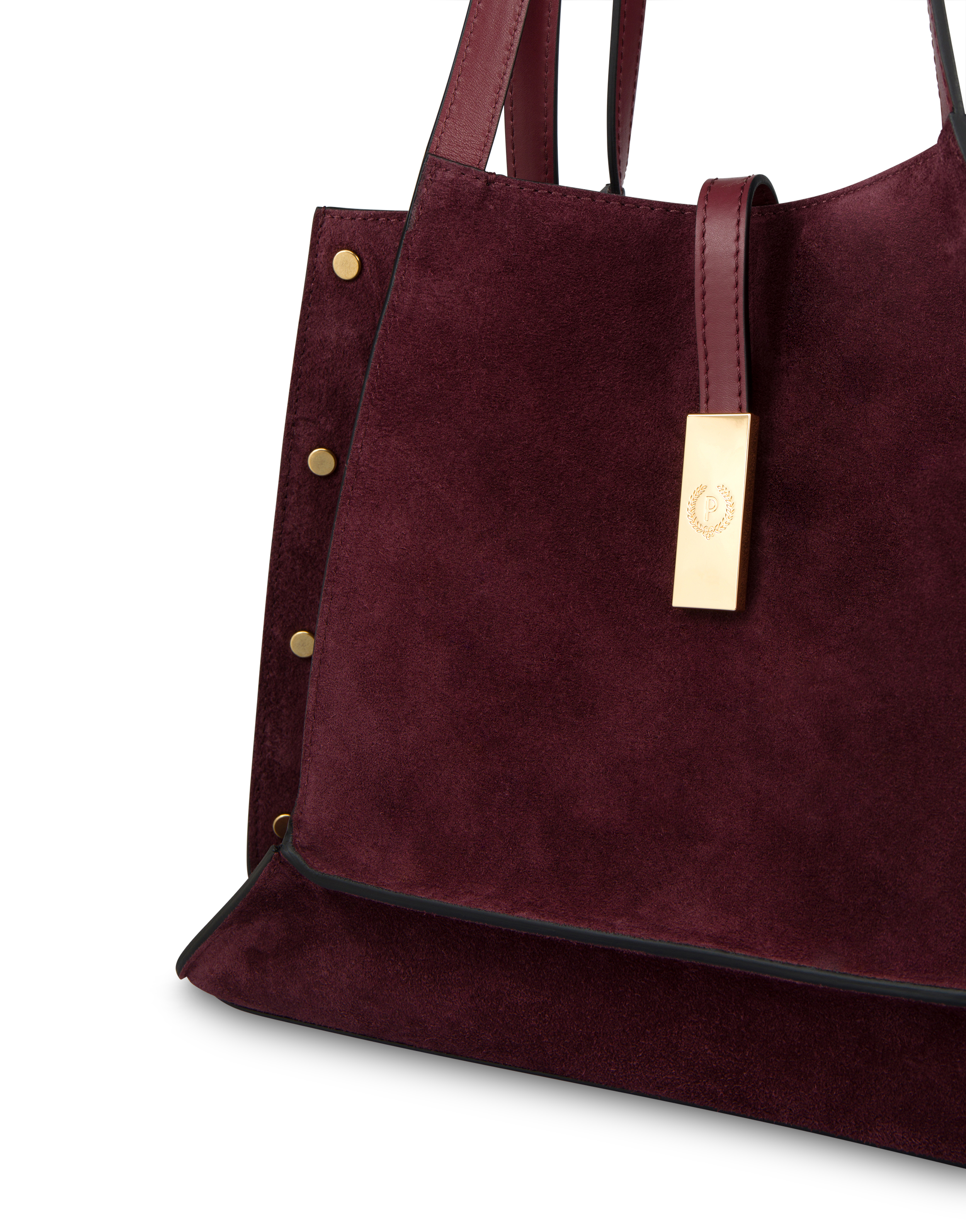 One of the collection's most timeless icons, the Austin Double Handle Bag combines character and sophistication. Made of split leather with smooth calfskin inserts, it stands out for its adjustable handles with metal buckle and the strap closure with magnet. Simple yet sophisticated, it has a lined interior with an internal pocket and a leather logoed label. The decorative studs and the plaque with the engraved 'P laurel' logo add a distinctive flair. Versatile carrying styles, either by hand or over the shoulder. Gold-plated finishes.