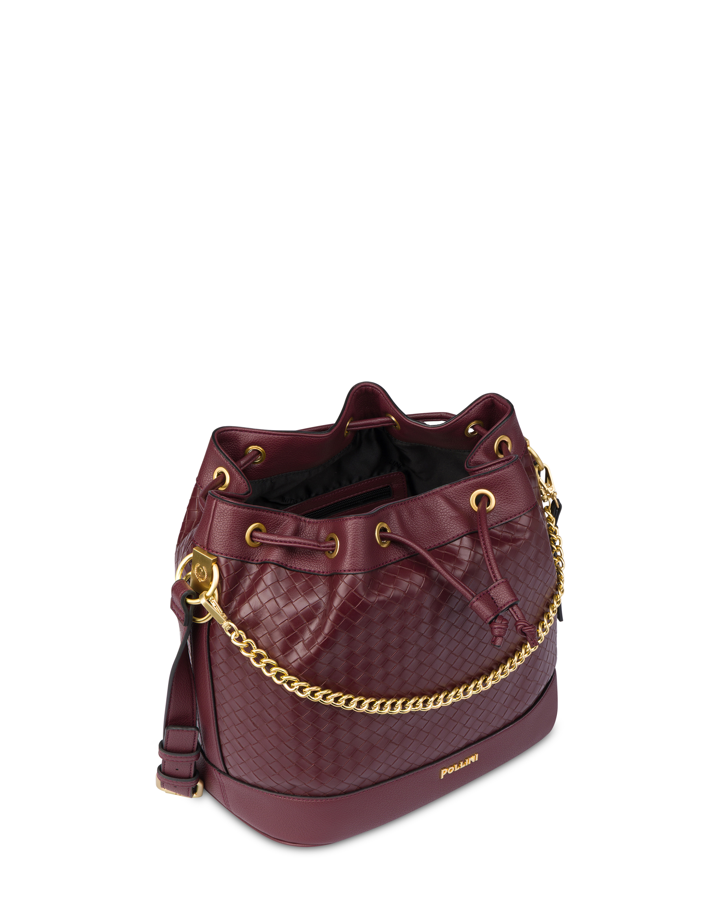 With a refined and contemporary style, this woven-look model stands out for its meticulous details and sophisticated silhouette, perfect for enhancing any look. The design is enriched by a metal logo on the front and brushed gold-plated finishes, while the drawstring closure and contrasting charm add a distinctive and original flair.