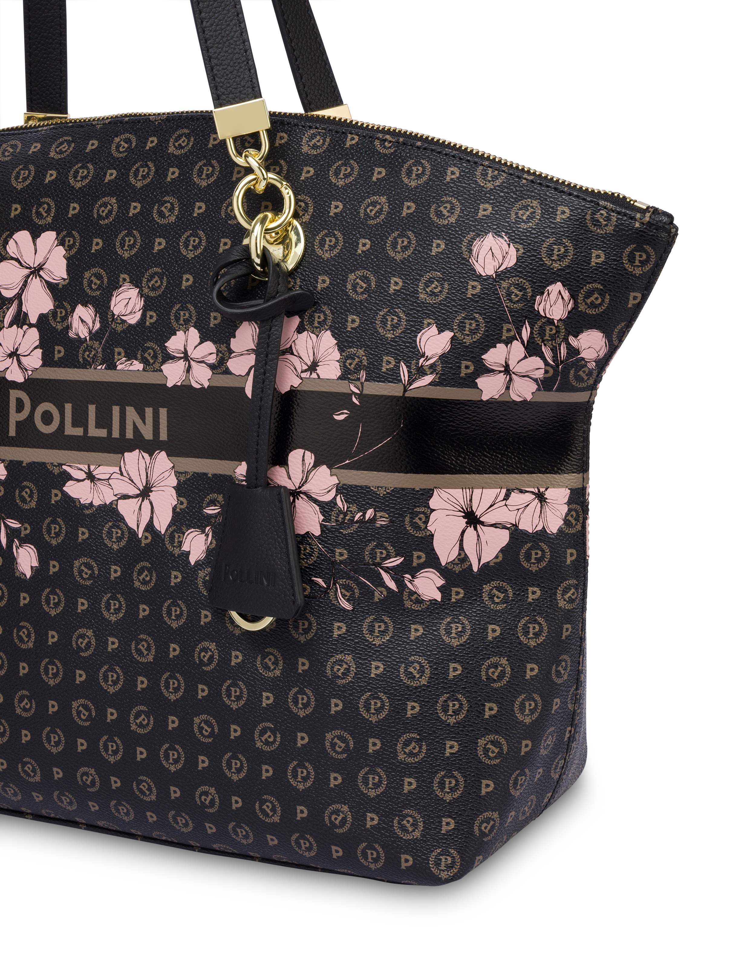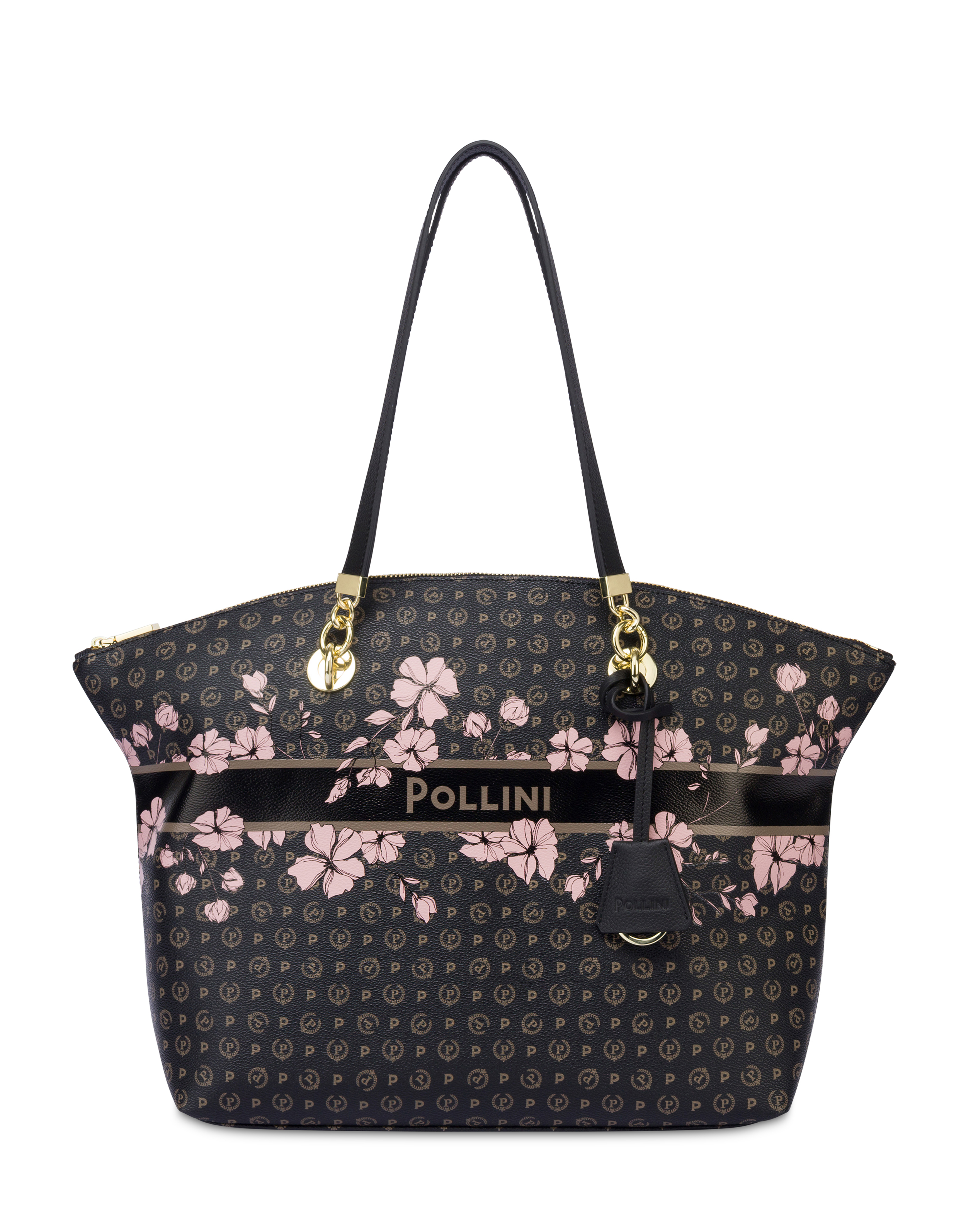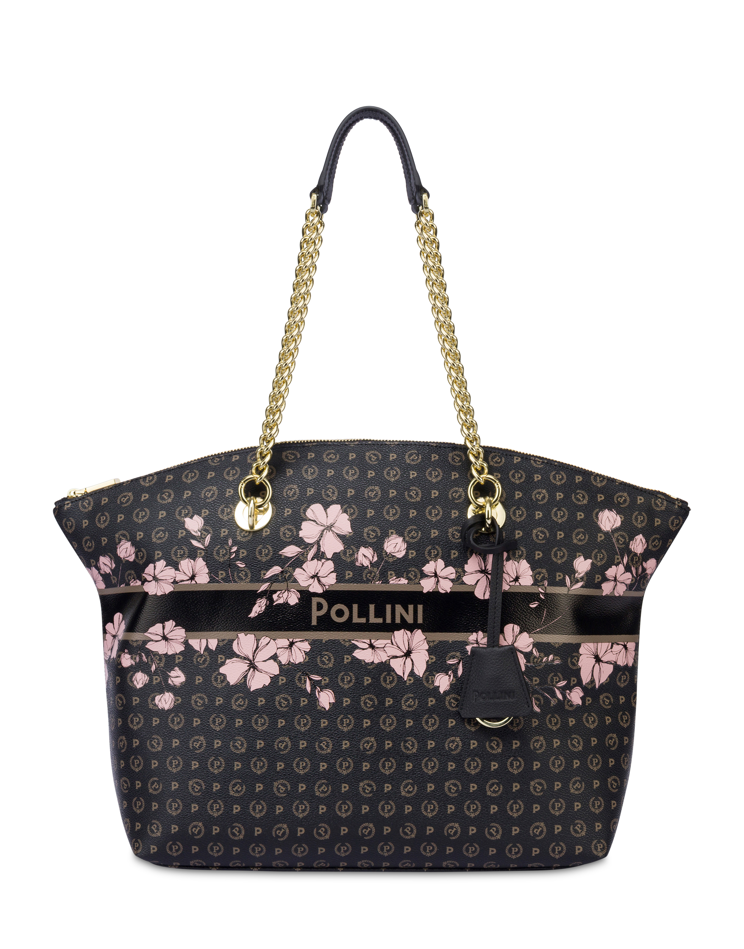 An elegance that blossoms in every detail. The Heritage Marina Flower Tote Bag combines the classic and iconic Pollini all-over pattern with the freshness of a floral border, for a sophisticated and feminine look. The front lettering logo blends harmoniously with leather and chain handles, both removable for boundless versatility. The design is completed by the removable clochette key ring, the zip closure on the top, and the spacious, lined and organized interior with pockets. Finished with light gold plating, it is the perfect accessory to brighten up every day in style.