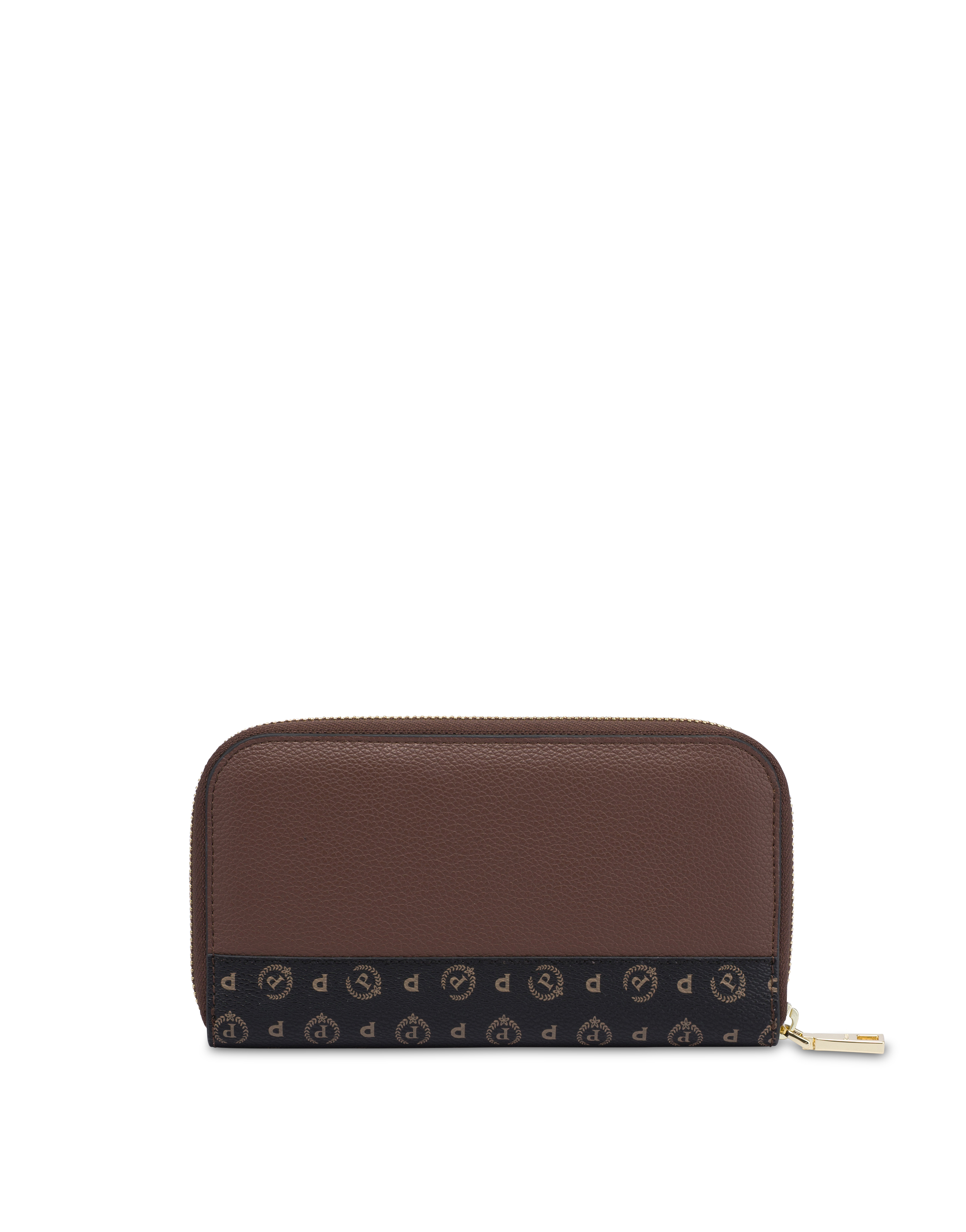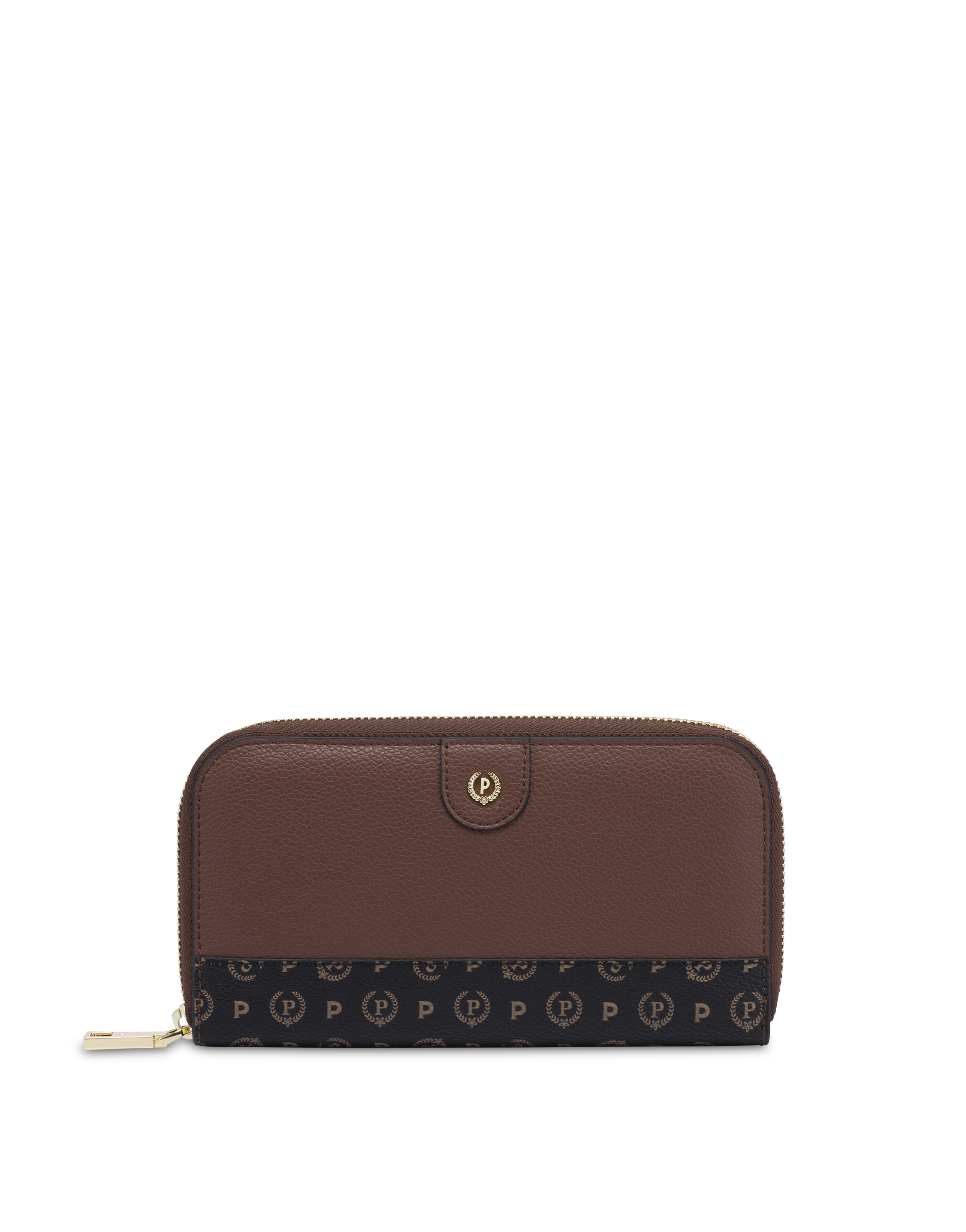 'Elegance and functionality come together in this Zip Around wallet, which stands out for its sophisticated design embellished by a horizontal band with the 'Heritage' motif. The gold zip closure ensures security and style. The interior is perfectly organized with two spacious compartments, a central zip coin pocket, and numerous spaces for cards and documents. The iconic gold metal 'P' laurel logo adds a distinctive and sophisticated touch.'