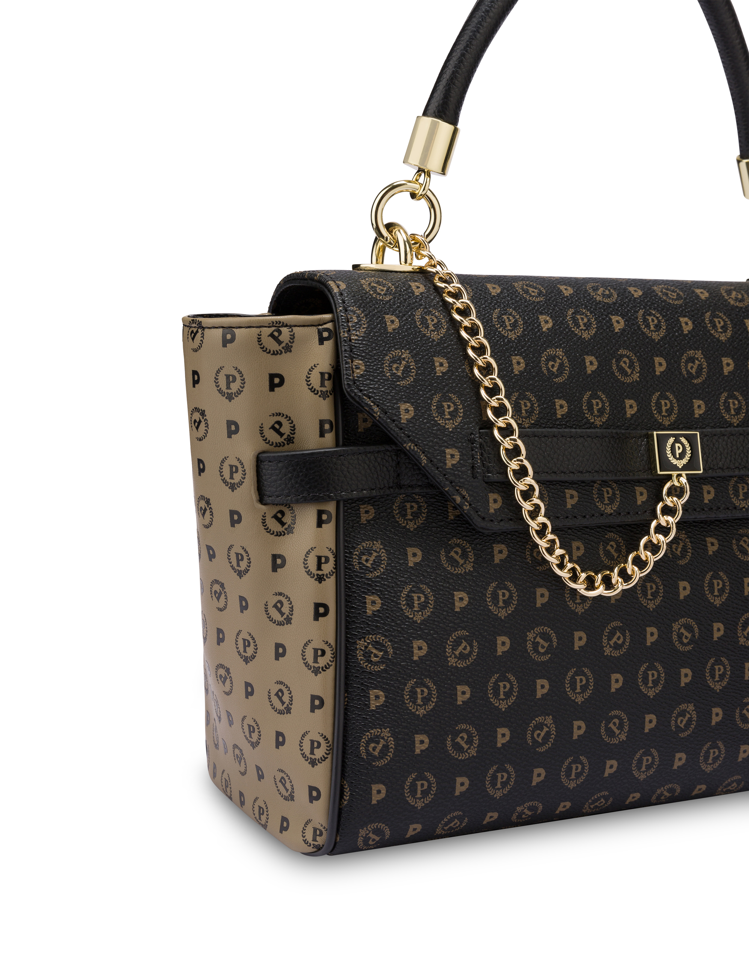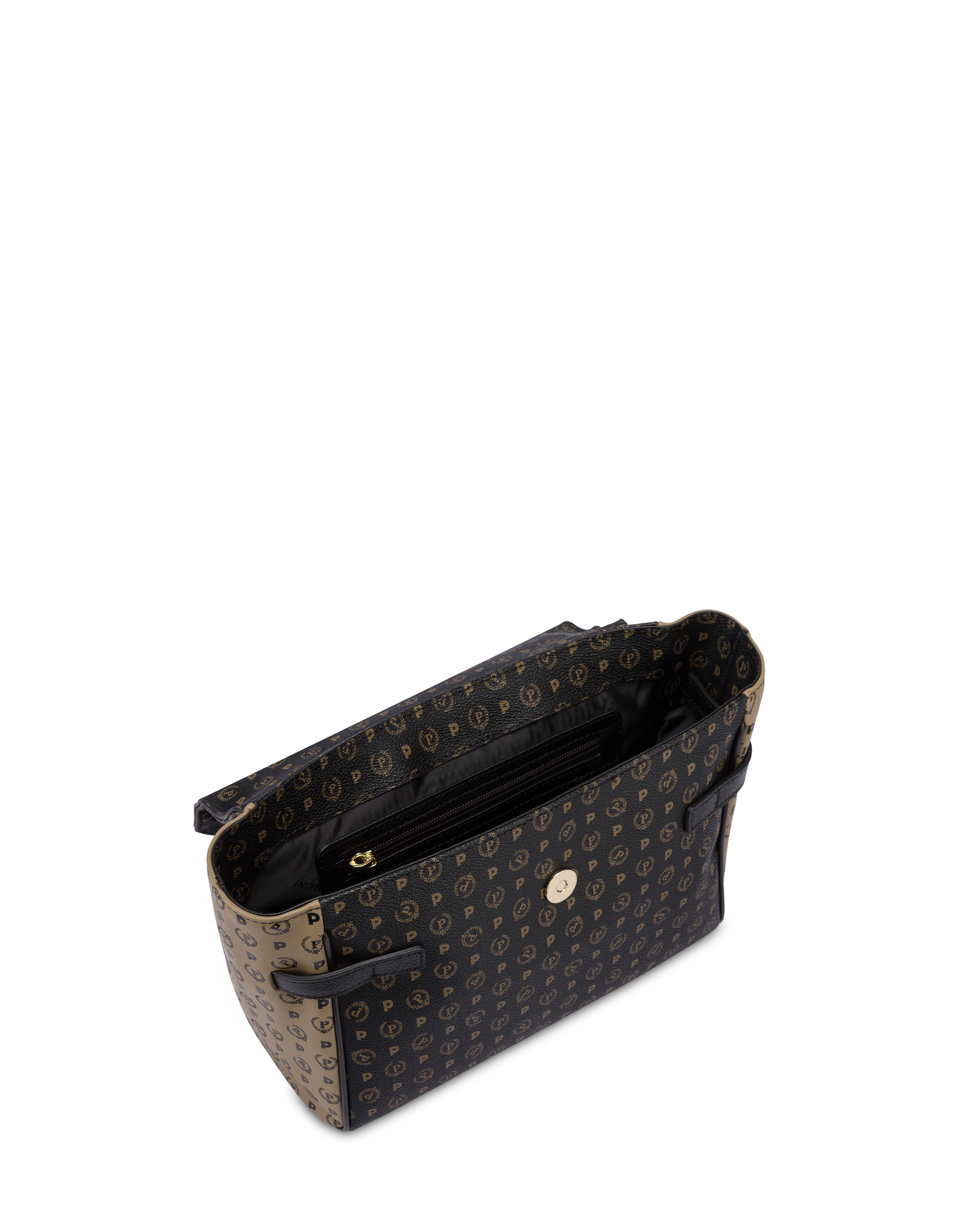 Borsa a tracolla bicolore realizzata per l'esclusiva capsule collection Heritage Soft Touch. I quadranti centrali sono nel classico pattern Heritage, mentre i fianchi, morbidi e destrutturati, sono caratterizzati dall'effetto stampa a rilievo, che conferisce morbidezza e tridimensionalità al tatto. Il modello è adornato da un cinturino con placchetta smaltata P-alloro e catenella in galvanica oro chiaro.