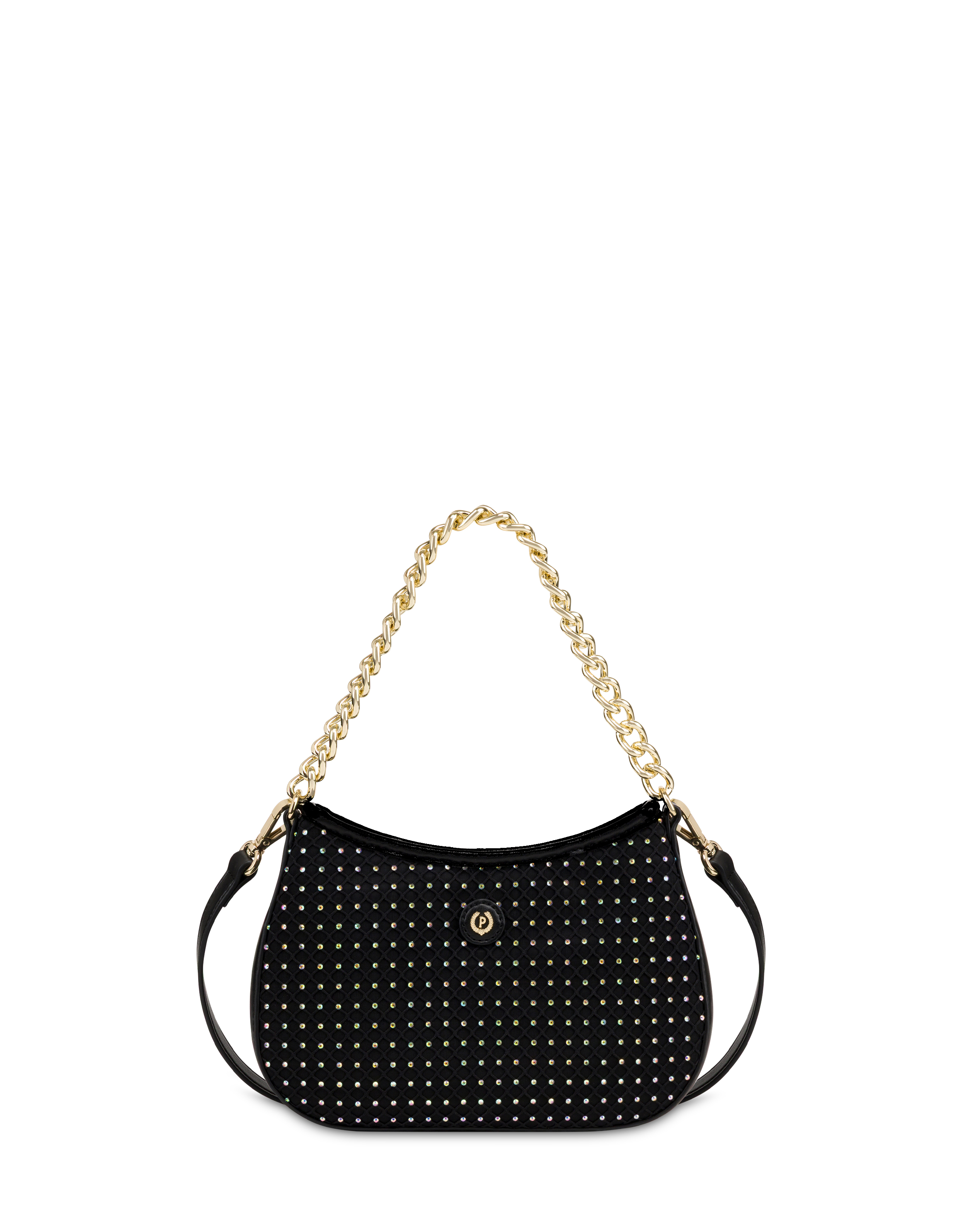 Borsa crossbody dal design elegante, pensata per una doppia portabilità grazie alla tracolla in tono. Il manico in catena con finitura brush gold illumina il modello con un accento sofisticato. Realizzata in materiale morbido, è ideale per le occasioni speciali. Il logo “P Alloro” centrale completa il design con un dettaglio discreto e ricercato.