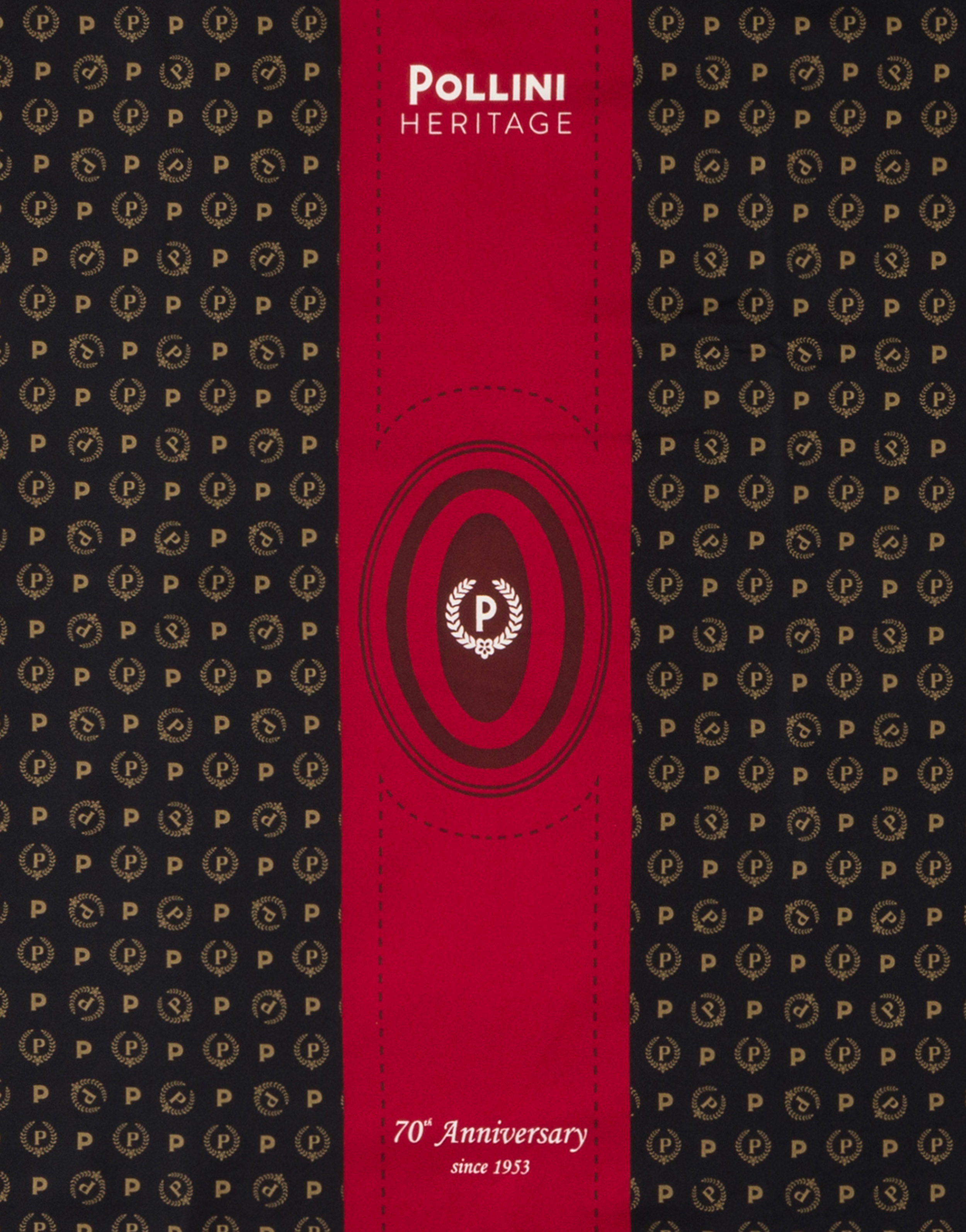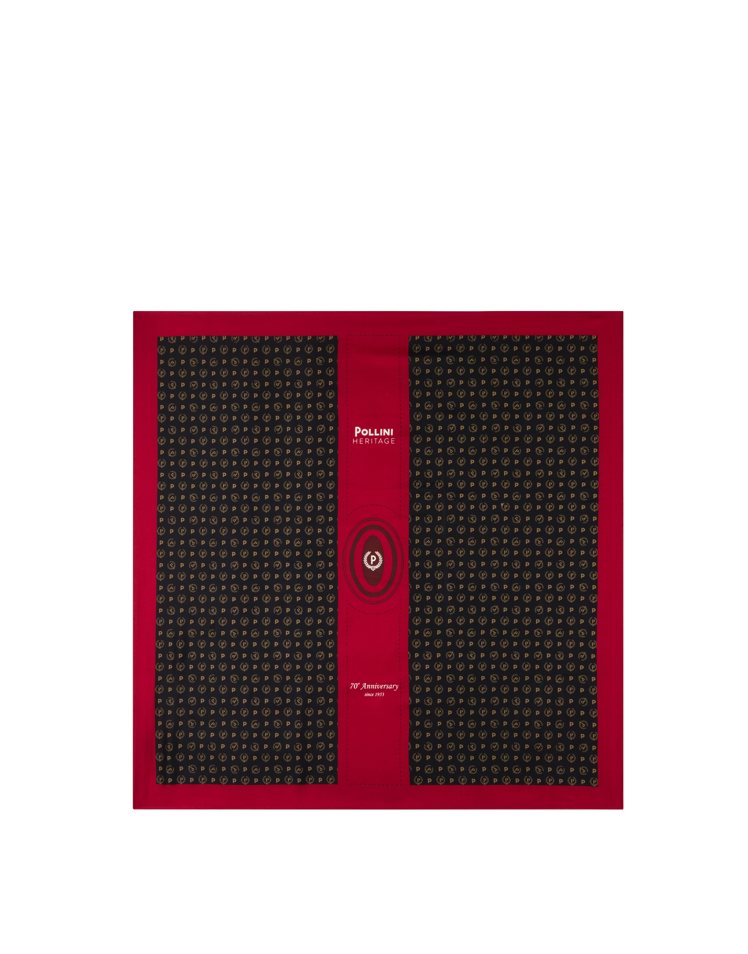 Foulard realizzato per l'esclusiva capsule Heritage 70th Anniversary. Per celebrare i 70 anni di attività, Pollini si immerge nella sua storia, traendo ispirazione da un'iconica elaborazione del logo Pollini. La storica ricorrenza è ricordata con la frase celebrativa '70th Anniversary since 1953'.