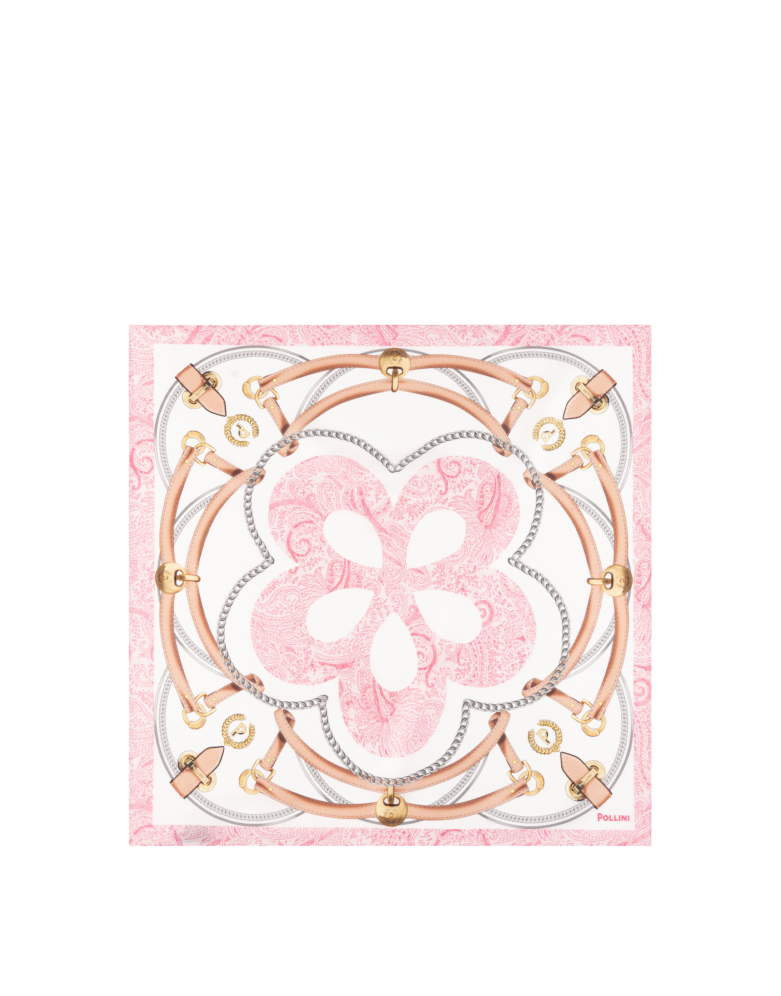 Foulard in twill di seta stampato con elementi equestri simmetrici che ricreano un disegno floreale o mandalico. Lo stile decorativo richiama i motivi classici del Brand.