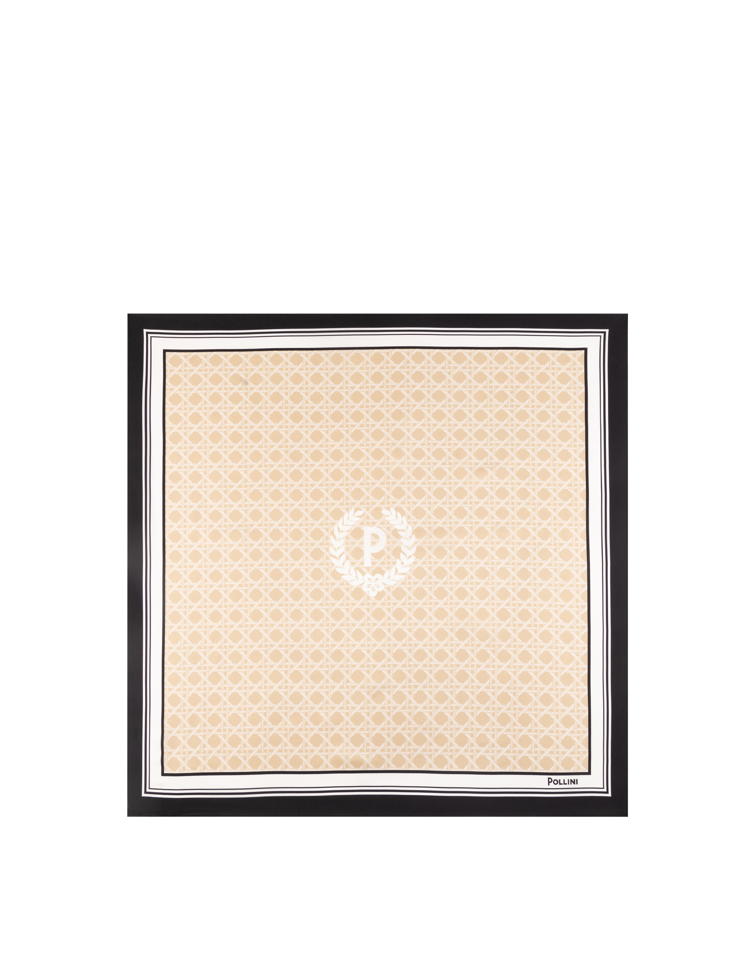 Foulard in twill di seta stampato geometrico e logo Pollini nella parte centrale. Una doppia cornice monocolore abbraccia la stampa e nella parte laterale in basso troviamo il logo Pollini a contrasto.