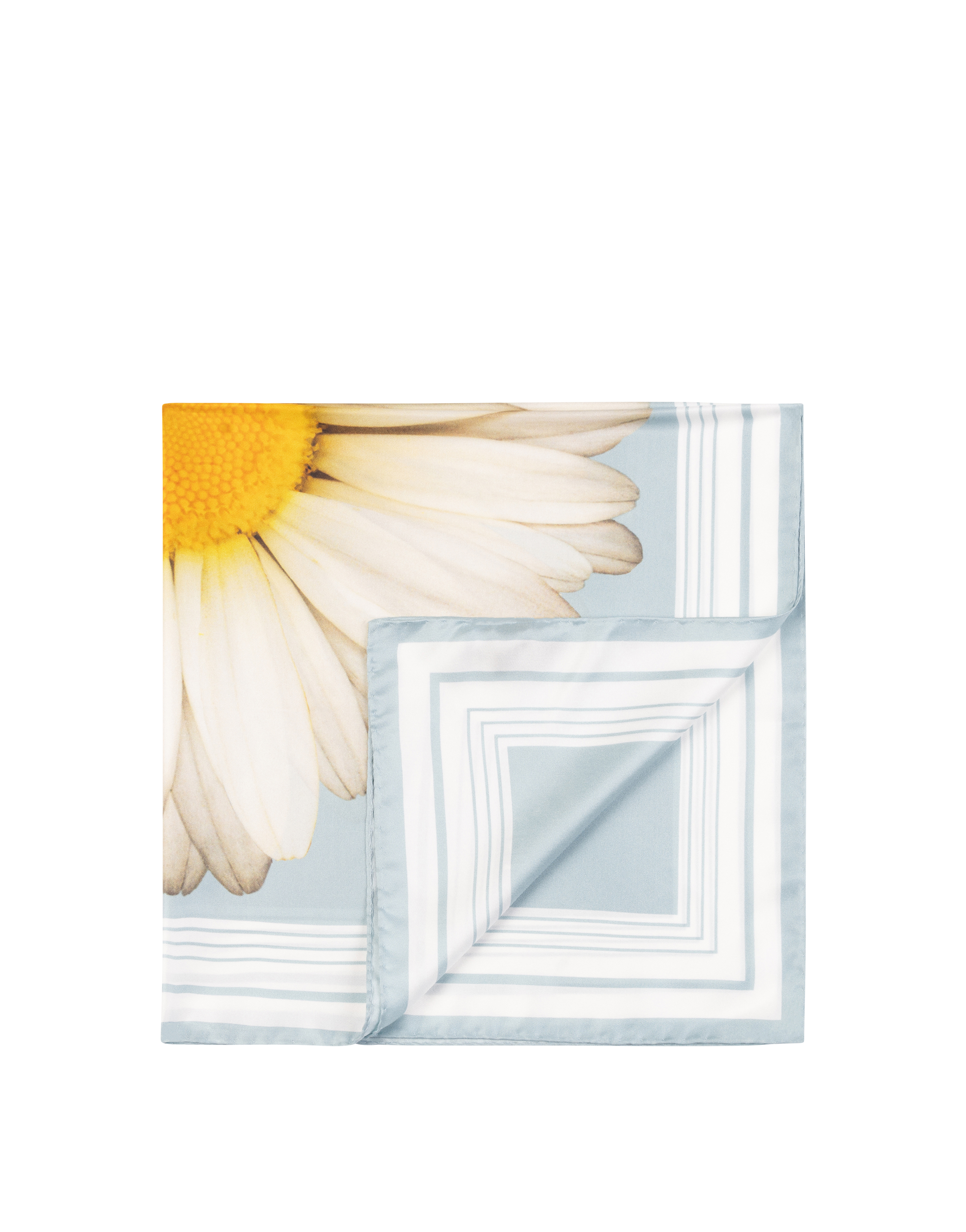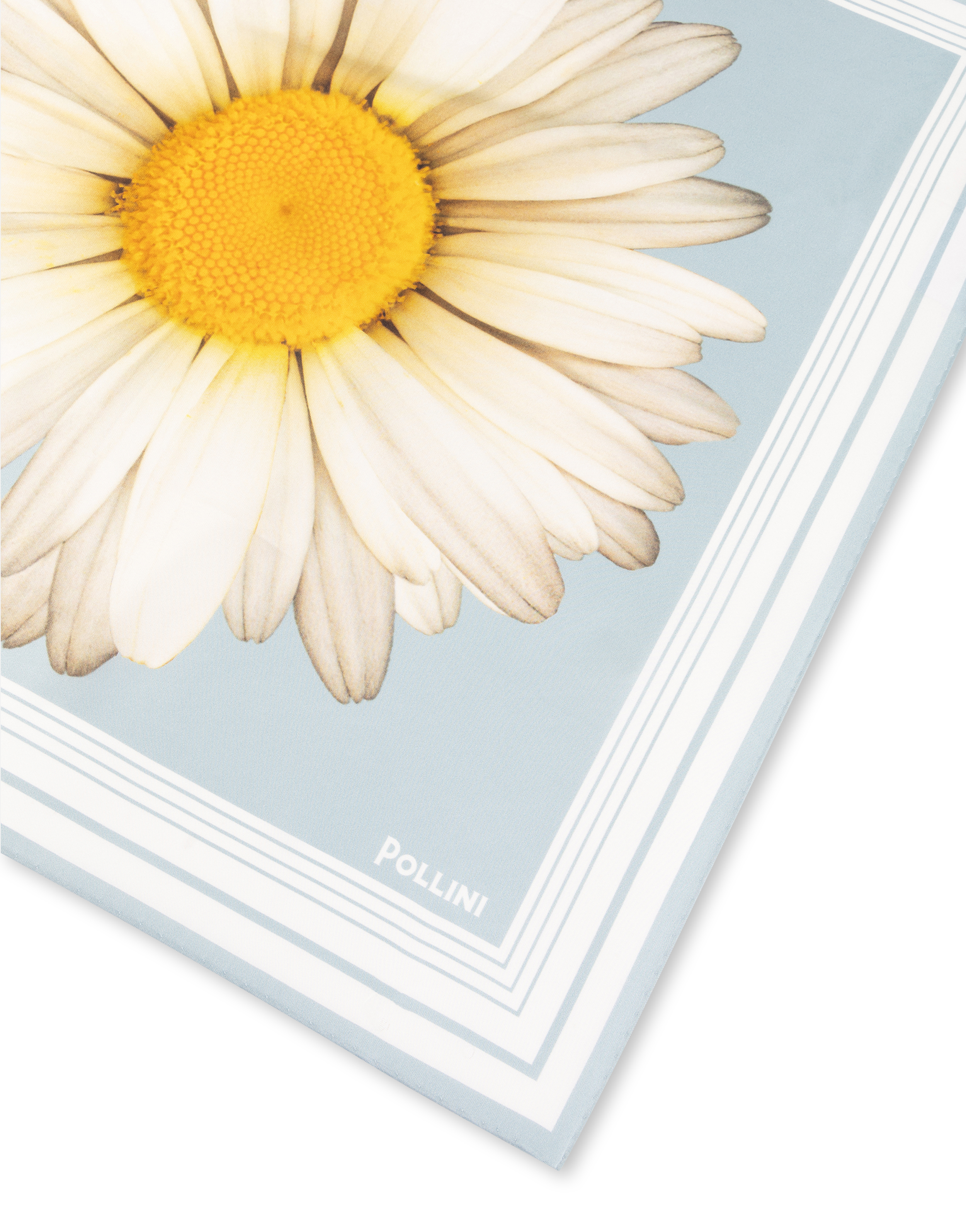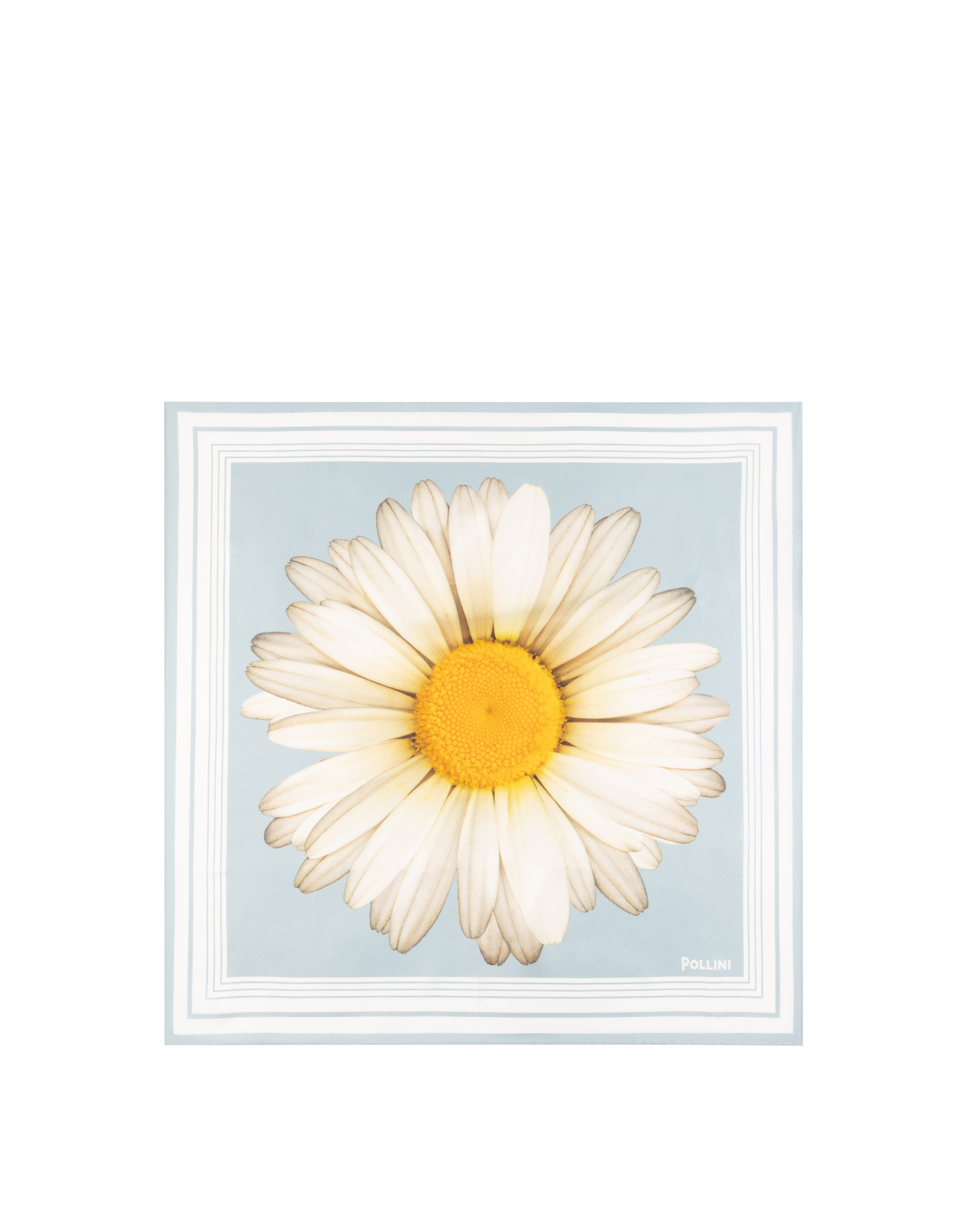 Foulard in twill di seta stampato con maxy margherita sul centro, su fondo monocolore. Una cornice monocolore abbraccia il fiore e nella parte laterale in basso troviamo il logo Pollini.