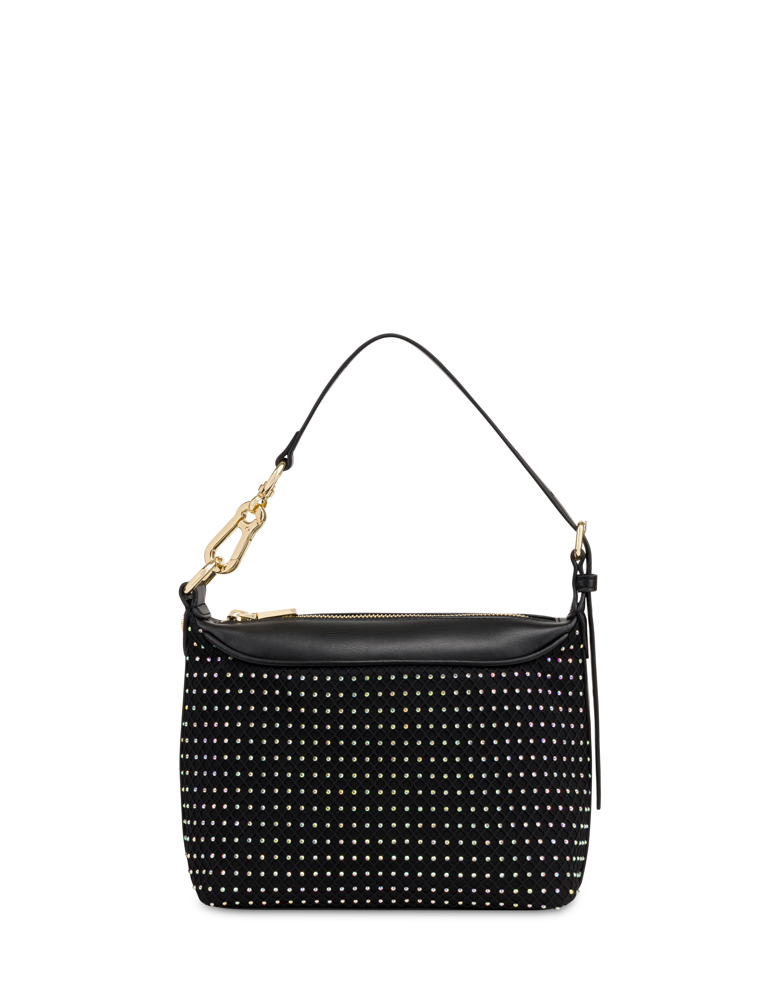 Piccola Hobo Bag compatta e raffinata, dalla linea pulita e strutturata. Versatile e distintiva, accompagna con naturalezza ogni occasione, esprimendo un’eleganza senza tempo. Caratterizzata da una qualità artigianale impeccabile e proposta nell’iconico nero, unisce stile e praticità. La chiusura con zip assicura funzionalità, mentre il manico regolabile consente una doppia portabilità, a mano o a spalla. La delicata rete con applicazioni in cristalli avvolge la borsa, catturando la luce e donando al design un carattere luminoso, sofisticato e inconfondibile.