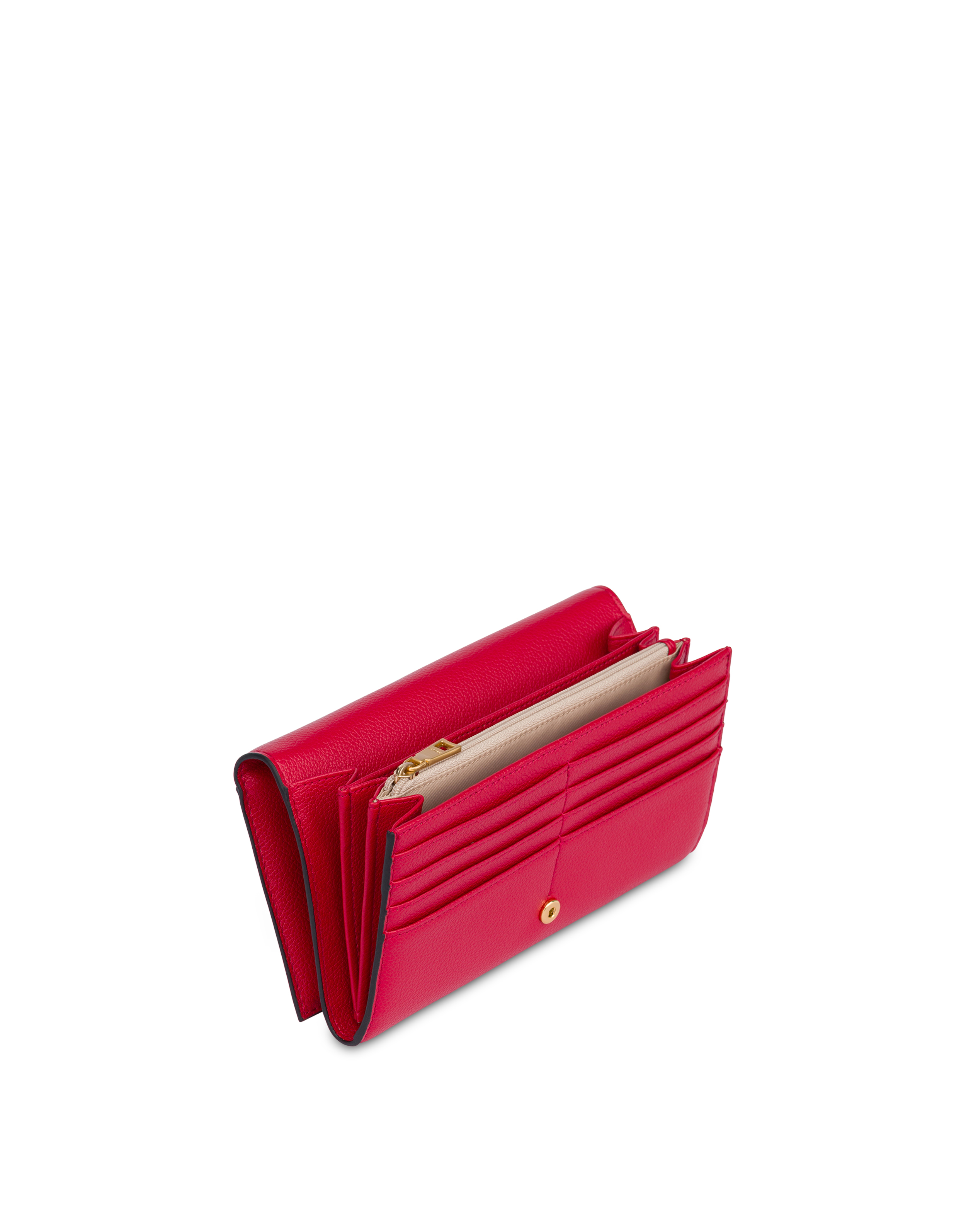 Eleganza compatta e funzionalità perfetta. Con il logo lettering frontale, questo portafoglio offre 3 scomparti interni, 2 tasche per banconote, una tasca con zip per monete e 16 spazi per carte. La chiusura con bottone automatico assicura praticità e sicurezza, per un accessorio essenziale e raffinato.